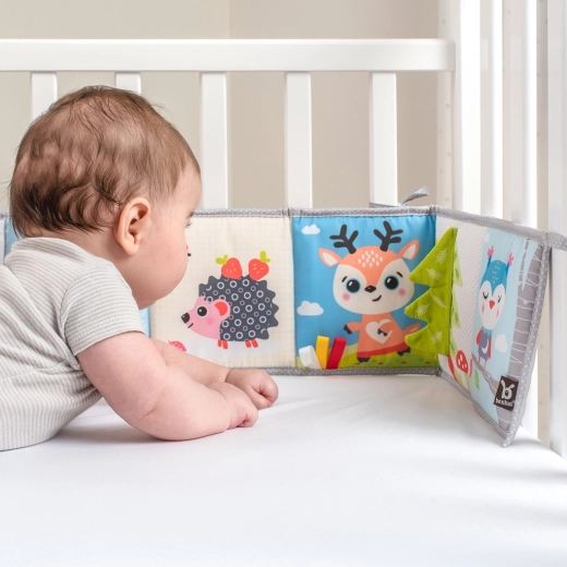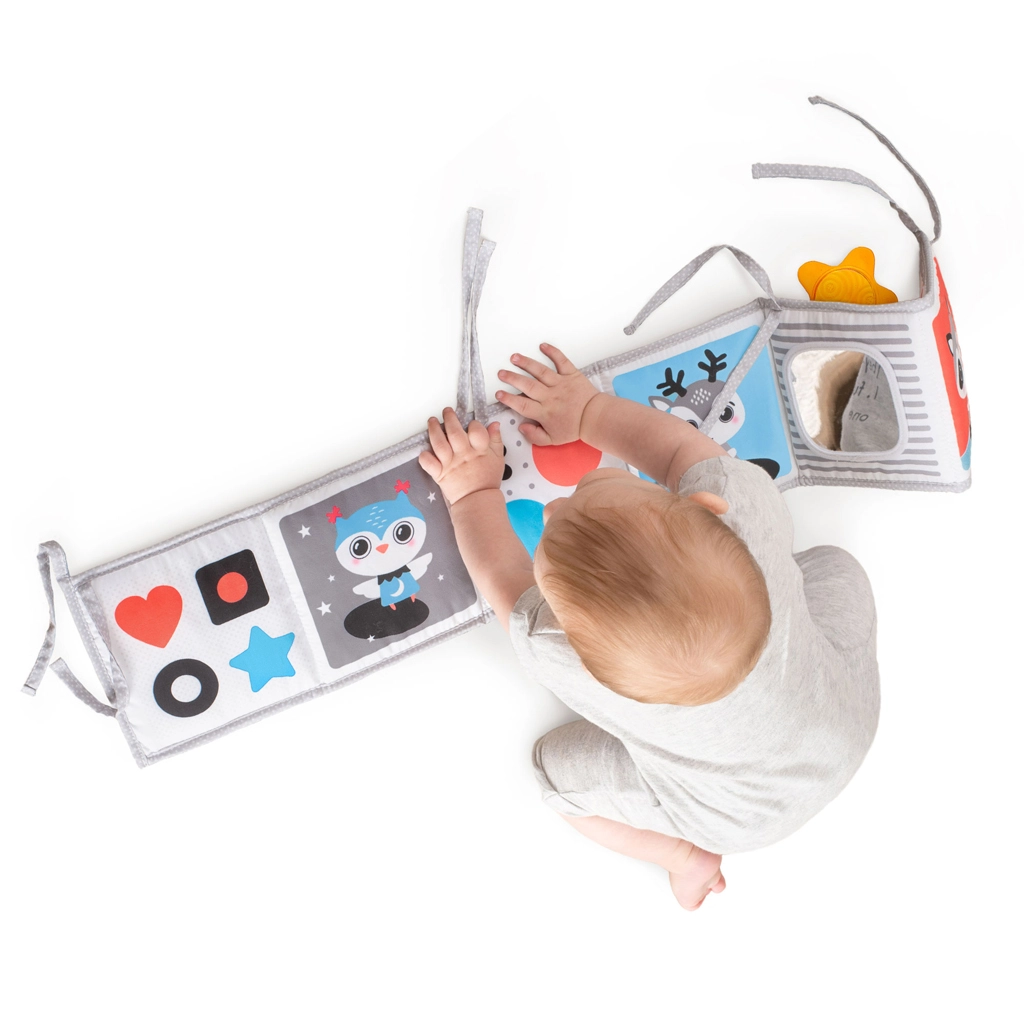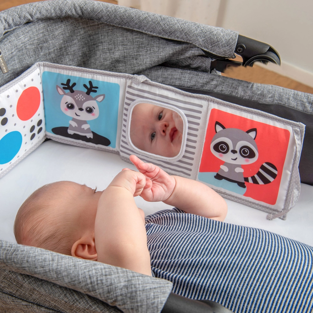 Morbido libricino in tessuto per neonati dalla nascita che favorisce la stimolazione visiva, il tummy time e la scoperta sensoriale. Offre un lato in bianco e nero per i neonati e un lato a colori per le fasi di sviluppo successive, un grande specchietto sicuro, elementi fruscianti e tattili e la possibilità di stare in piedi, essere posizionato piatto o legato alla culla o al passeggino. Si piega facilmente e si porta ovunque.
