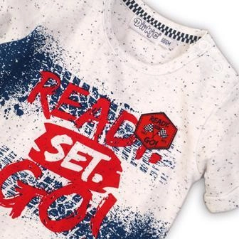 Elegante maglietta per bambini DIRKJE a maniche corte in colore bianco, ideale per tutti i giorni. Offre una vestibilità confortevole, materiale morbido e piacevole e un motivo giocoso “Ready Set Go!” che i bambini adoreranno. Scelta perfetta per un comfort quotidiano e per abbinarla facilmente ad altri capi.