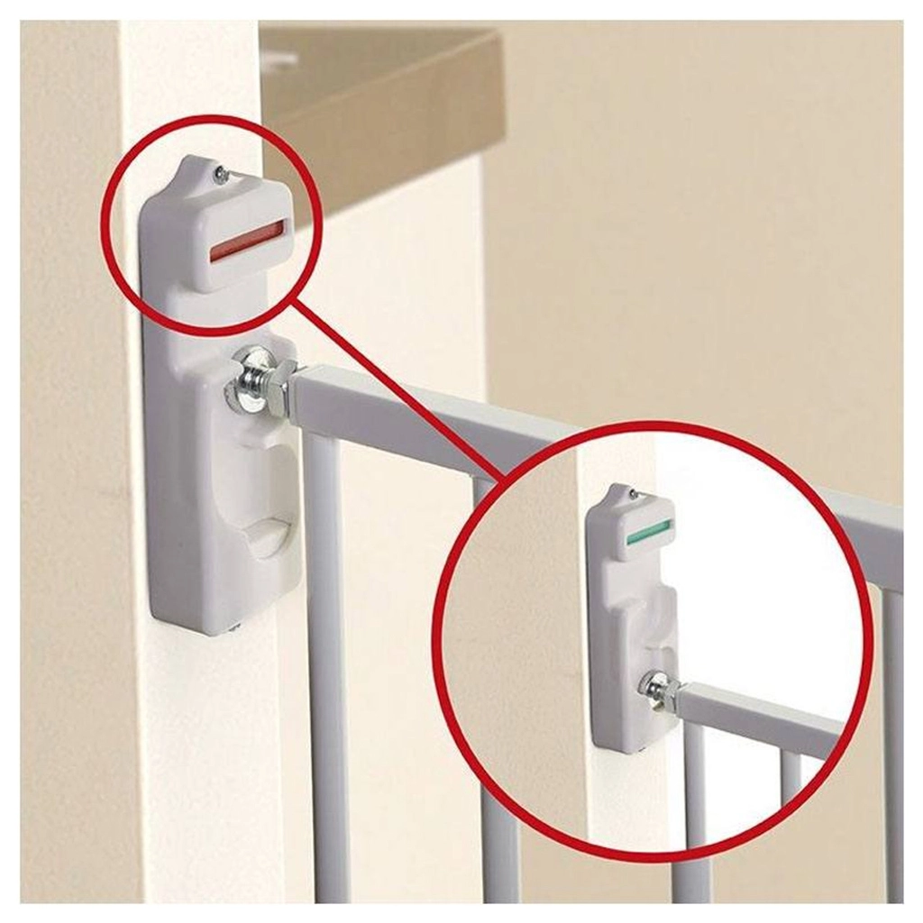 Per l’uso sulle scale, il movimento del cancello può essere limitato a una sola direzione tramite una linguetta girevole o removibile. L’esclusivo Indicatore EZY-Check mostra chiaramente lo stato di blocco: verde quando è correttamente fissata, rosso quando è sbloccata. Il montaggio fisso con ferramenta garantisce massima stabilità e lunga durata.