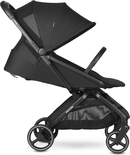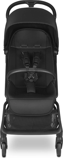 Dalla nascita puoi usarlo con navicella o seggiolino auto (tramite adattatori). La dotazione pratica include cinture a 5 punti, barra di sicurezza girevole e removibile, poggiapiedi regolabile, ammortizzazione su tutte e quattro le ruote con freno avanzato e cestello capiente fino a 7 kg. I tessuti premium in plastica riciclata sono facili da mantenere e la seduta con riduttore si può rimuovere e lavare facilmente.