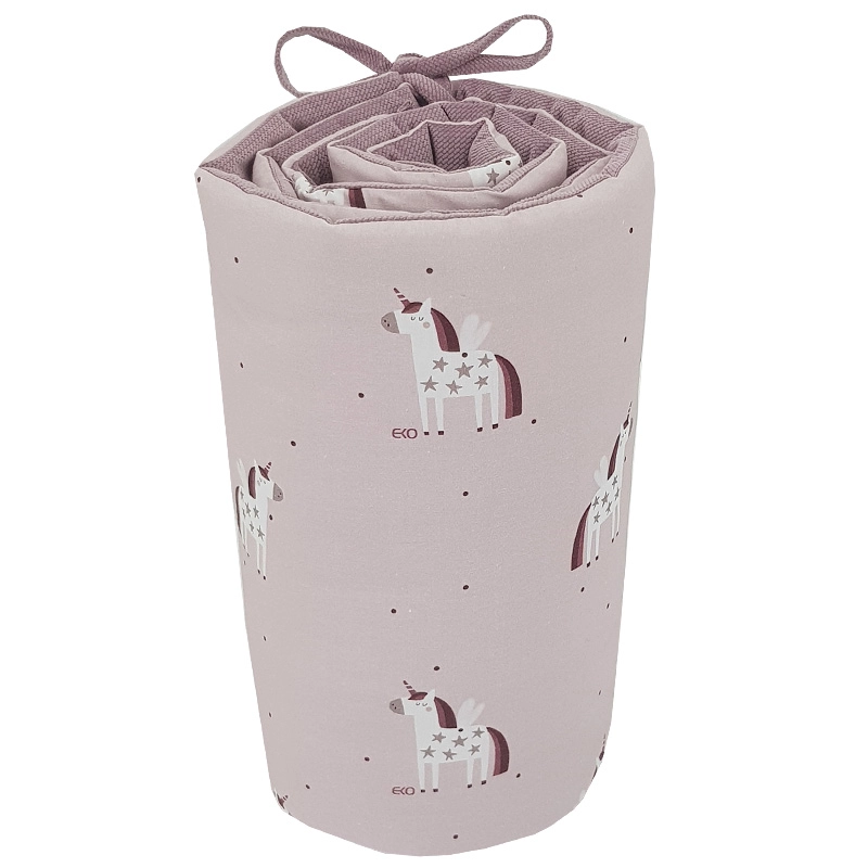 Il paracolpi per lettino EKO Unicorn nelle dimensioni 180 × 35 cm protegge il bambino dal contatto con le sbarre e dalle correnti d’aria. Un lato in cotone 100% stampato e l’altro in morbissimo VELVET offrono una gradevole sensazione al tatto e un aspetto elegante. L’imbottitura è in fibra cava in silicone ipoallergenica, leggera, traspirante e indeformabile.