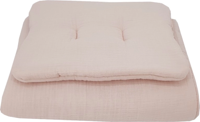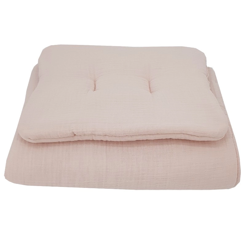 Regala al tuo bebè un sonno tranquillo con questo set in mussola per lettino da 2 pezzi nel delicato tono powder pink. La mussola di cotone 100% è leggera e traspirante, straordinariamente morbida al tatto, elastica e gradevole sulla pelle sensibile. Il set comprende un cuscino 30 × 40 cm e una copertina 75 × 100 cm con imbottitura anallergica per un sonno confortevole e sicuro.