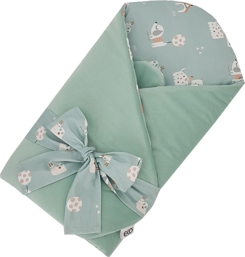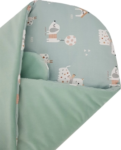 Fascia avvolgente per neonati morbida e sicura, realizzata in una combinazione di cotone di alta qualità e del soffice materiale VELVET, imbottita con fibra anallergica. Include un inserto in cocco removibile per un sostegno più stabile del neonato nelle prime settimane. La fascia offre calore, comfort e supporto, presenta una chiusura a strappo e un fiocco decorativo nel design Dogs Mint.