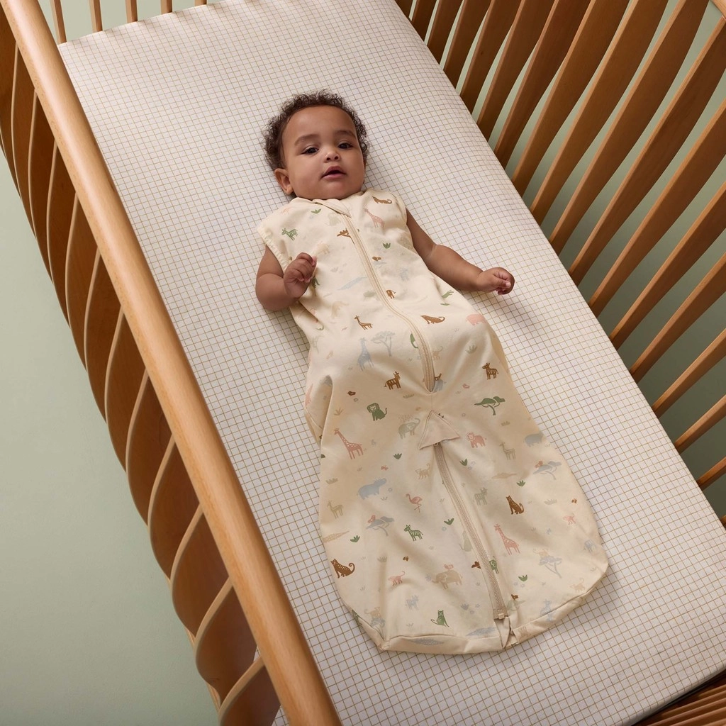 Il cotone biologico GOTS traspirante aiuta a regolare la temperatura in stanze da 24 °C in su senza coperte aggiuntive. Le maniche 1,0 TOG offrono un leggero isolamento.