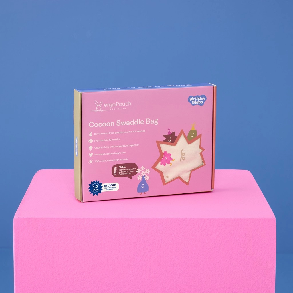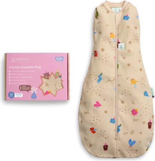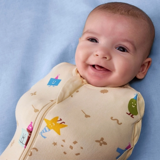 La collezione Birthday Blobs porta una stampa giocosa con simpatici personaggi che illumina ogni sonnellino. Il modello Cocoon è progettato per sostituire facilmente la fasciatura e allo stesso tempo mantenere il bebè al sicuro e comodo. Il valore 1 TOG è ideale per ambienti con temperatura 21–24 °C senza bisogno di ulteriori coperte.