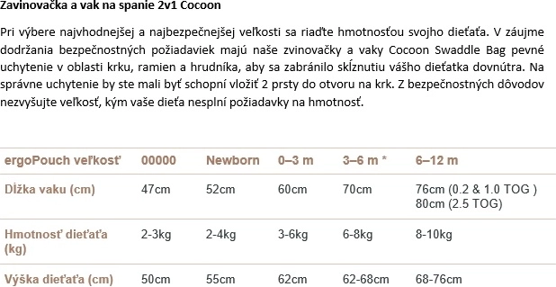 La soluzione intelligente 2in1 permette di utilizzare Cocoon prima come fascia e poi, aprendo i bottoncini sulle spalle, come sacco nanna con braccia libere ai primi segni di rotolamento. Il 2,5 TOG è ideale per temperature della stanza di 17–23 °C senza bisogno di ulteriori coperte, mentre l’area del torace con circa 1,0 TOG previene il surriscaldamento e consente una respirazione libera.