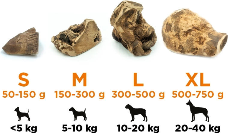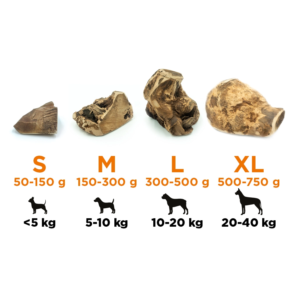 A differenza del legno comune, la radice non si scheggia in pezzi affilati. Durante la masticazione aiuta a rimuovere meccanicamente la placca dai denti e contribuisce al mantenimento dell’igiene dentale. Grazie alla sua elevata durezza resiste anche a un uso intensivo e intrattiene il cane a lungo.