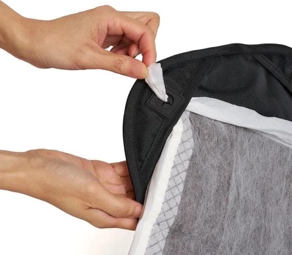 Vano extra large con finestra a rete per un flusso d’aria costante e un’ottima visuale. Il tettuccio si apre sia nel senso di marcia che in senso opposto, la chiusura è assicurata da una clip brevettata.