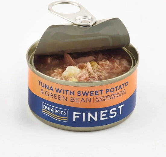FISH4DOGS Finest combina un’elevata percentuale di tonno (50%) con delicate patate dolci e croccanti fagiolini. La composizione leggera, gustosa e delicata, senza cereali, è ideale come complemento al pasto principale o come premio profumato. Grazie alla consistenza succosa si somministra facilmente ed è ben digeribile.