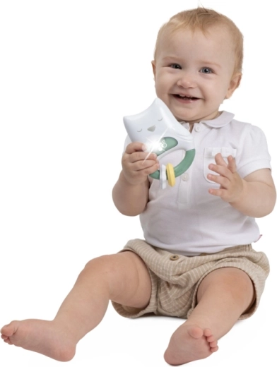 L’anello ergonomico e i delicati anellini da scuotere favoriscono la presa e lo sviluppo della motricità, mentre luci e suoni stimolano i sensi.