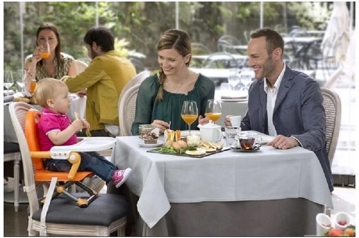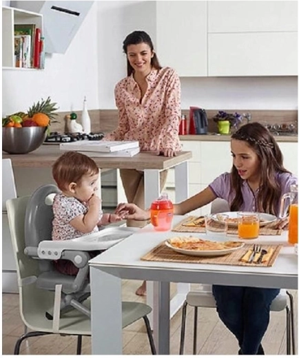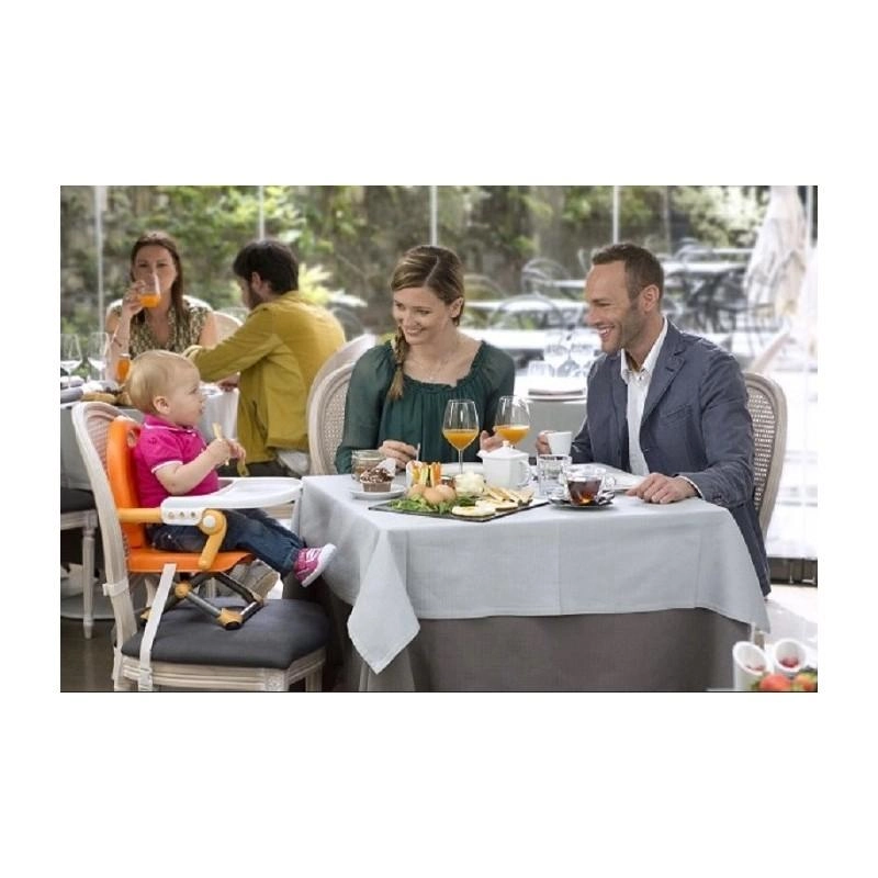 Il design pieghevole compatto con maniglia integrata facilita il trasporto e il riponimento. Gli elementi antiscivolo e la base stabile contribuiscono alla sicurezza a ogni pasto: a casa, dai nonni e al ristorante.