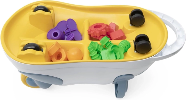 Dai 18 mesi il bambino spinge il gioco capovolto come una cariola e trasporta in sicurezza piccoli oggetti. Stimola creatività e autonomia.