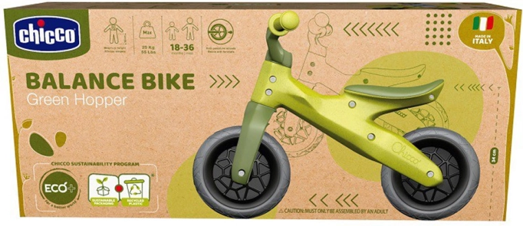 Chicco Green Hopper Eco+ è una balance bike perfettamente bilanciata per i più piccoli dai 18 ai 36 mesi. Design minimalista, manopole sicure e altezza di accesso ridotta agevolano i primi passi verso la guida autonoma. Le ruote larghe e antiforatura garantiscono un movimento fluido e sicuro su superfici piane.