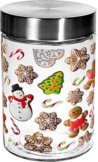 Elegante barattolo in vetro TORO da 1100 ml con motivo natalizio di omini di pan di zenzero, ideale per riporre dolci fatti in casa e alimenti sfusi. Il coperchio in metallo con guarnizione garantisce una protezione affidabile del contenuto da umidità e impurità, mentre il vetro trasparente permette di avere tutto a portata di sguardo. Pratico, elegante e utilizzabile tutto l’anno.