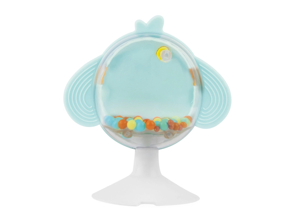 La ventosa stabile mantiene il gioco fissato al vassoio del seggiolone. Le ali testurizzate in morbida plastica leniscono le gengive, mentre le palline colorate nel corpo stimolano udito e vista.