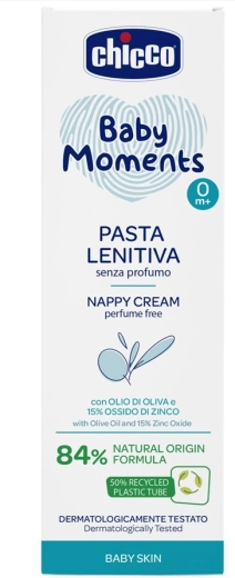 - Crema cambio (100 ml, 84% ingredienti naturali) – senza profumo, con 15% di ossido di zinco e pantenolo. Crea uno strato protettivo traspirante e aiuta a prevenire gli arrossamenti da pannolino.