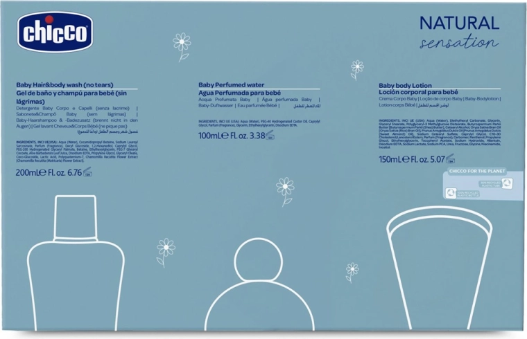 - Shampoo capelli e corpo 2 in 1 200 ml; Latte corpo 150 ml; Acqua profumata per bambini 100 ml