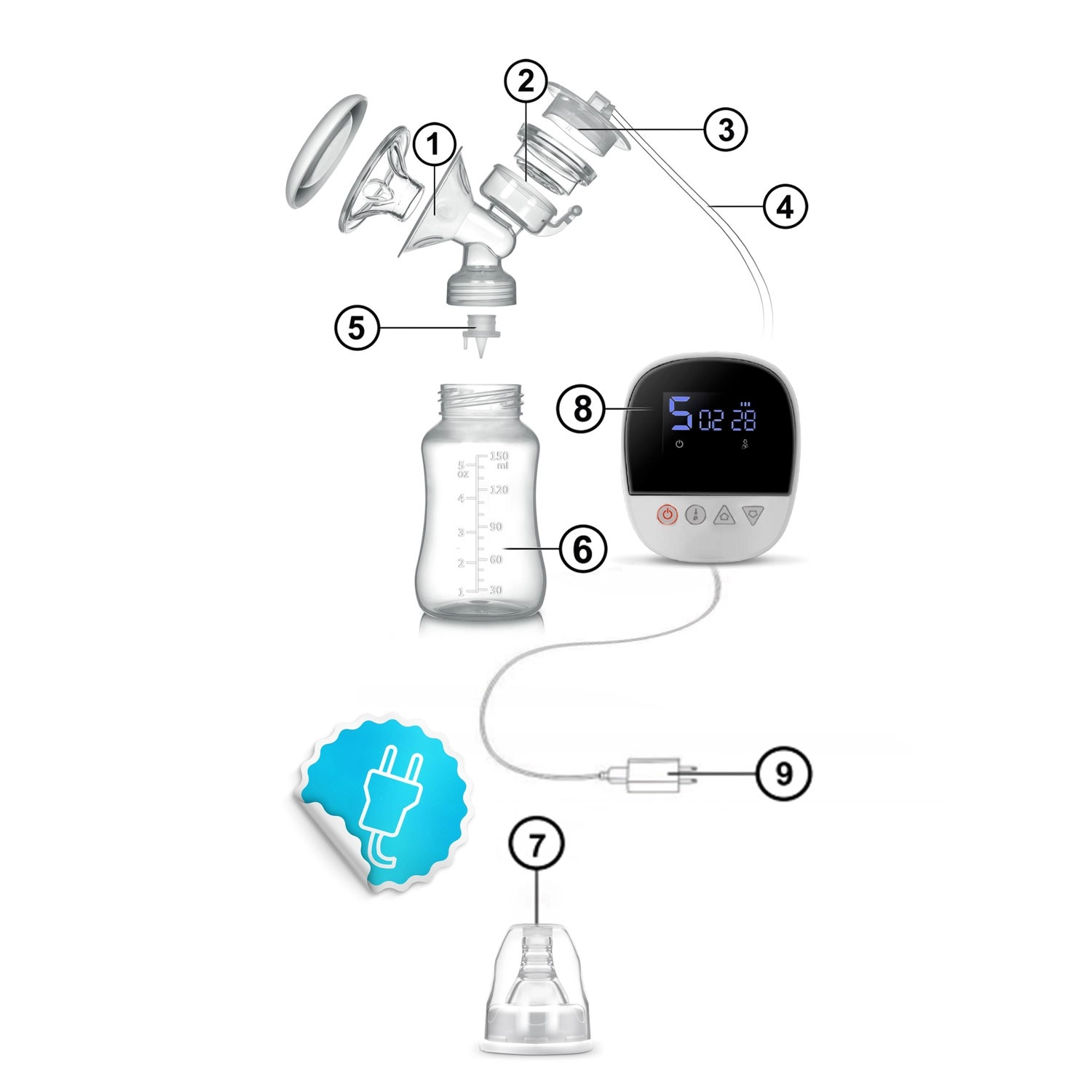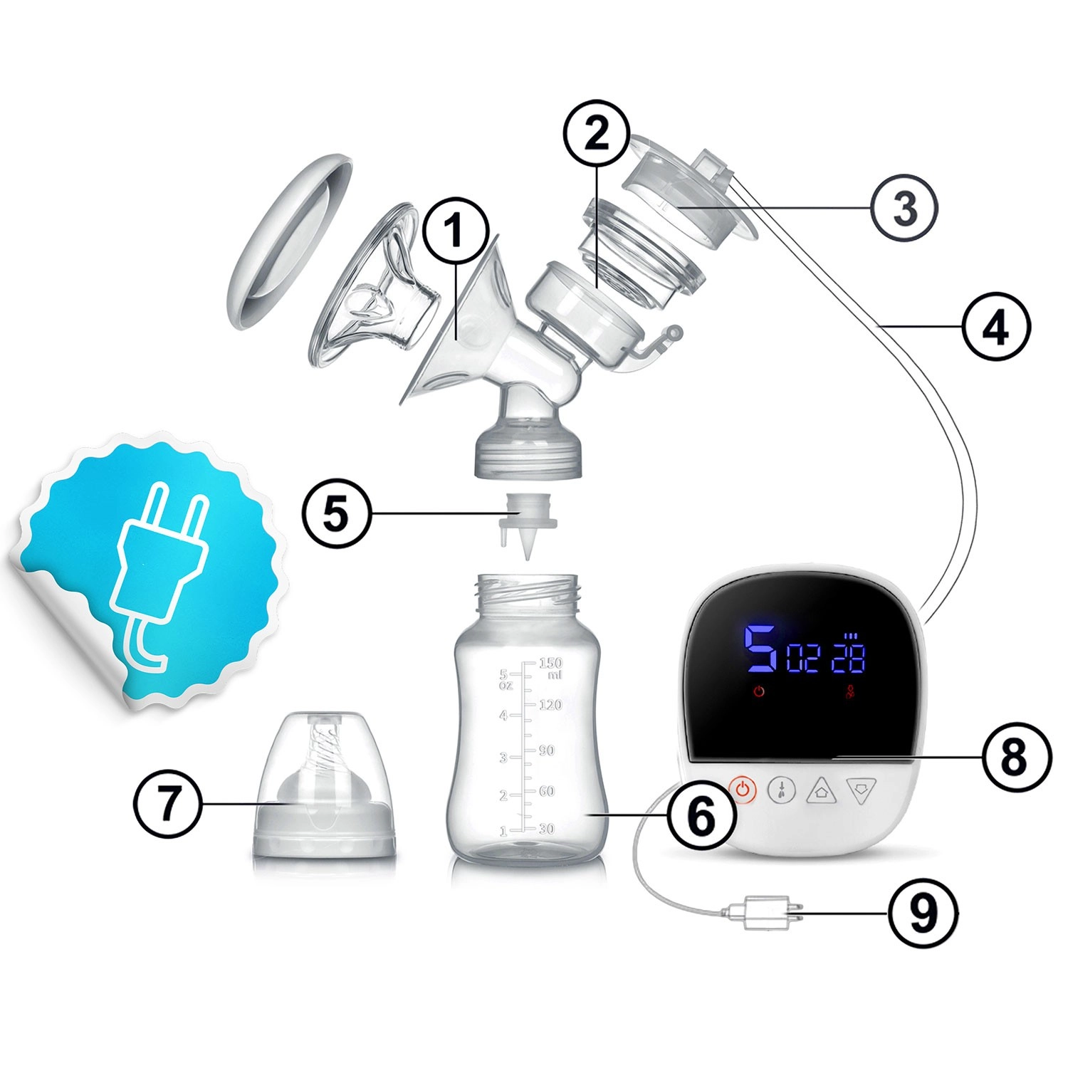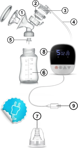 Il dispositivo è senza fili con batteria resistente, molto silenzioso e ideale in viaggio. Il pannello intuitivo con display mostra tempo, modalità, livello di aspirazione e stato della batteria. Tutte le parti a contatto con il latte sono senza BPA e conformi agli standard CE, LFGB, RoHS, REACH. Lo smontaggio rapido e la pulizia facilitano l’igiene quotidiana, mantenendo un alto livello di sicurezza per te e il tuo bambino.