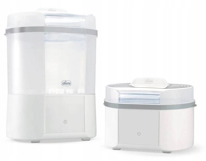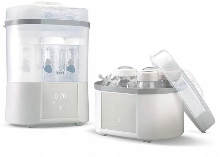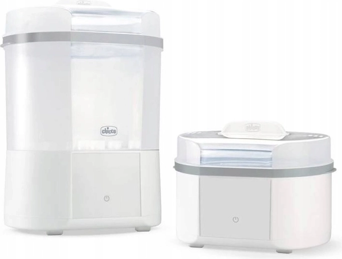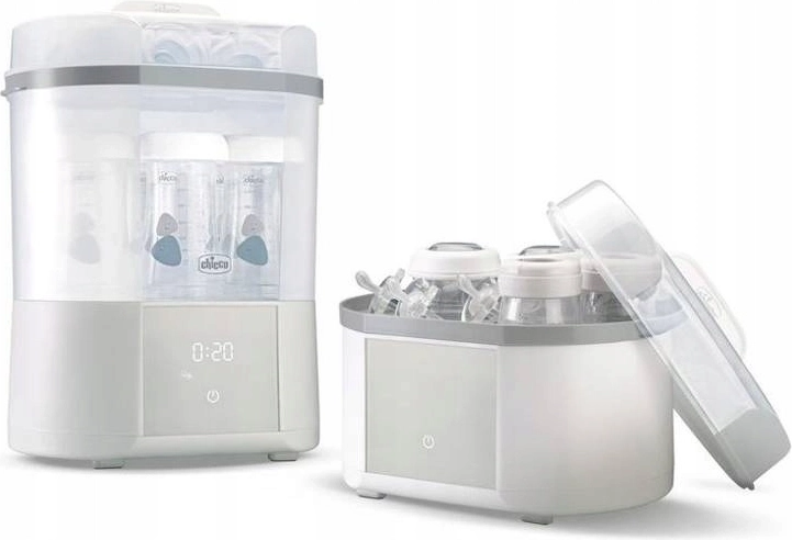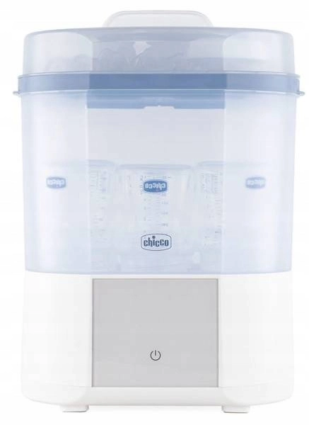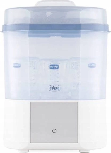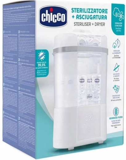 Il moderno sterilizzatore a vapore elettrico CHICCO garantisce una sterilizzazione naturale in 5 minuti e, grazie alla funzione di asciugatura integrata, elimina gocce e residui di umidità. Contiene fino a 6 biberon e accessori, offre programmi FULL e COMPACT, avvio ritardato e filtro avanzato per un funzionamento sicuro senza particelle di polvere. Scelta ideale per biberon, succhietti e altri accessori igienicamente puliti.