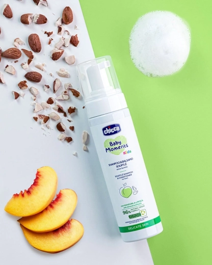 Scoprite una cura che i bambini ameranno: la soffice e profumata schiuma CHICCO Baby Moments Kids Soufflé 2in1 deterge con delicatezza e al tempo stesso facilita la pettinatura. Grazie alla combinazione di estratti di mandorla e pesca, i capelli dei bambini restano morbidi, lisci e splendidamente lucenti. Non brucia gli occhi e rispetta la pelle sensibile dei più piccoli.