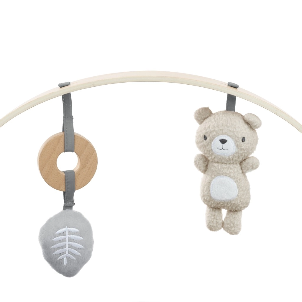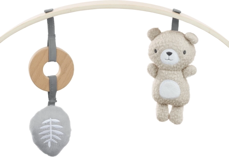 Si ripiega in piano per un facile trasporto e stoccaggio. La barra in legno con orsacchiotto in peluche e anello stimola i sensi e la coordinazione.