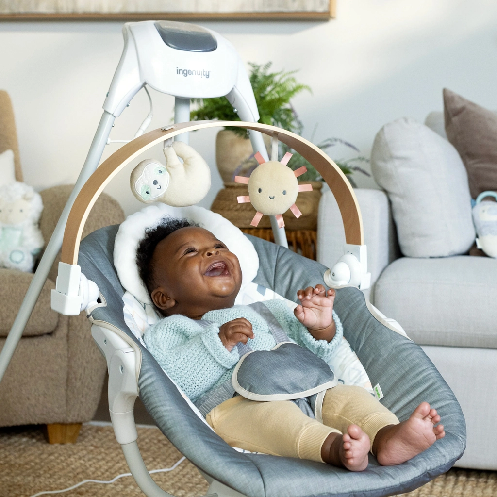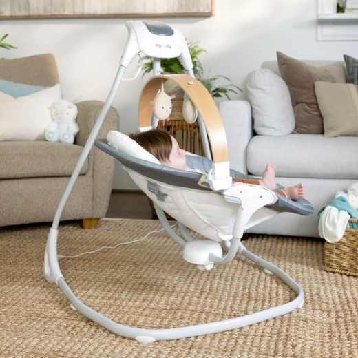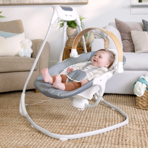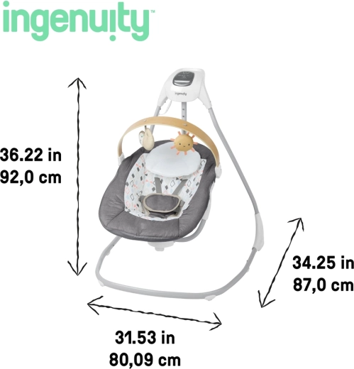 Calma e intrattieni il tuo bebè con la compatta altalena INGENUITY SimpleComfort Parker. Offre seduta girevole a 180°, dondolio in 3 direzioni, 6 velocità con tecnologia TrueSpeed, silenzioso motore WhisperQuiet e 8 melodie + 3 suoni della natura. La pratica alimentazione USB, l'archetto in legno rimovibile con 2 giochini e la struttura compatta con maniglia e ruote facilitano gli spostamenti e il riponimento. Per bambini dalla nascita fino a 9 kg.