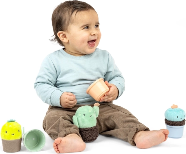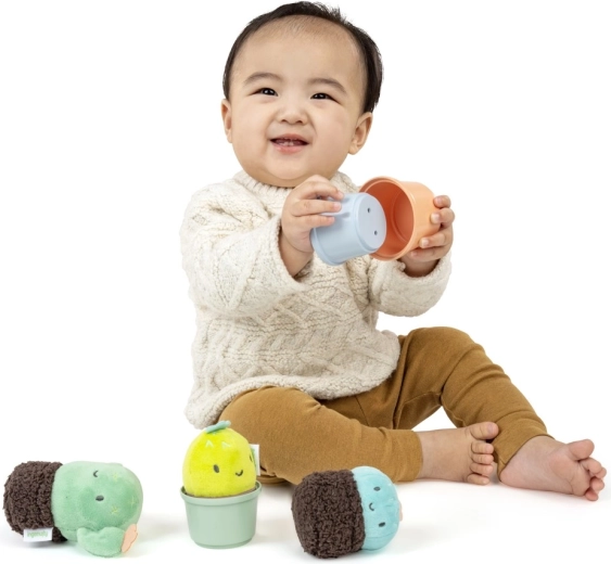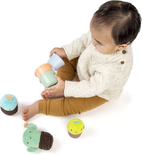 Ad ogni scuotimento arriva un suono delicato che stimola l’udito e la gioia della scoperta. I morbidi “cactus” in peluche sono facili da tenere anche per le manine più piccole, mentre i bicchierini lisci si possono inserire uno dentro l’altro o impilare. Il bambino impara così in modo naturale i principi di dimensione, ordine e orientamento spaziale.