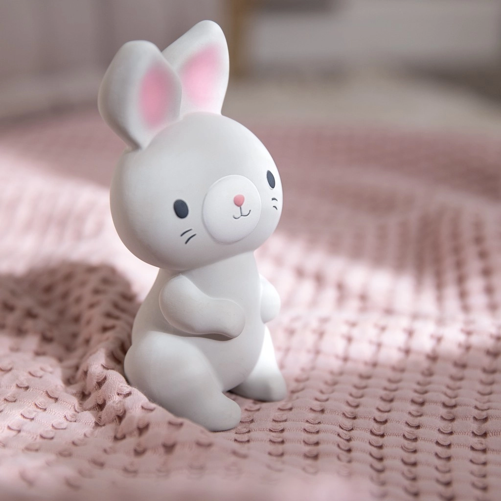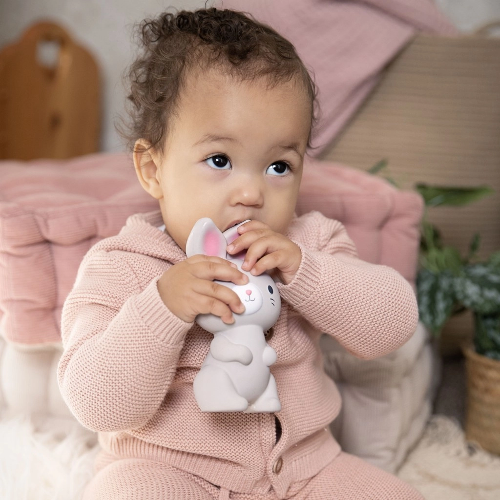 La forma ergonomica del coniglietto è progettata per essere tenuta comodamente dalle manine fin dalla nascita.