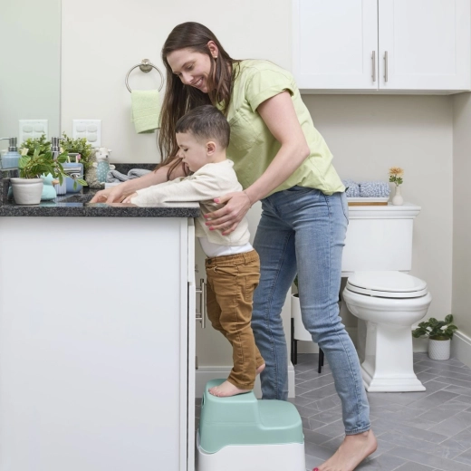Lo stabile sgabello a due gradini con superficie antiscivolo aiuta i bambini a raggiungere in sicurezza sia il WC sia il lavandino.