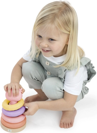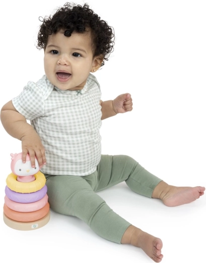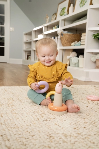 La solida base effetto legno mantiene la piramide stabile durante il gioco, mentre la gufetta in cima motiva i piccoli a completare la costruzione.