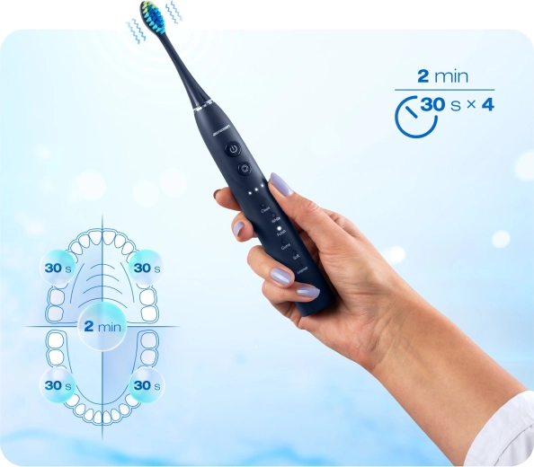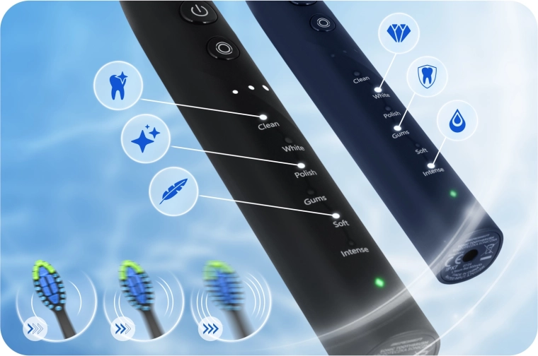 18 combinazioni di pulizia per le tue esigenze: 6 modalità (CLEAN, WHITE, POLISH, GUMS, SOFT, INTENSE) e 3 livelli di intensità. Dalla cura delicata per denti sensibili alla pulizia profonda intensiva – scegli facilmente quella giusta. Spegnimento automatico dopo 2 minuti e intervalli di 30 secondi facilitano la suddivisione della bocca in quattro quadranti per risultati uniformi.