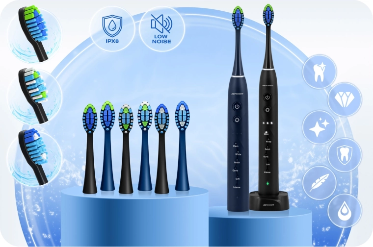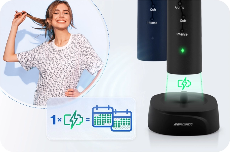 Scopri il comfort quotidiano e una cura professionale del cavo orale con il set di due spazzolini sonici BERDSEN Galaxy Duo. Potenza elevata fino a 40.000 movimenti al minuto, 6 modalità di pulizia e 3 livelli di intensità garantiscono denti e gengive perfettamente puliti. Nella confezione trovi 6 testine intercambiabili, un timer da 2 minuti con intervalli di 30 s, un’autonomia fino a 50 giorni con una sola ricarica e impermeabilità IPX8 – scelta ideale per coppie e famiglie.