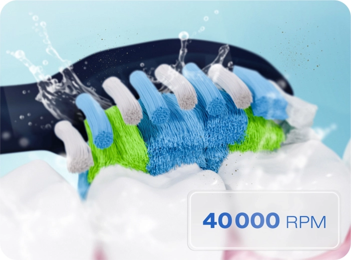La potenza della tecnologia sonica rimuove placca e discromie in modo rapido e delicato. Le testine con setole morbide si adattano alla forma del dente e, grazie al lato posteriore, puliscono facilmente anche la lingua per un alito fresco che dura a lungo. Il motore ad alte prestazioni genera fino a 40.000 vibrazioni al minuto e, insieme al timer intelligente, ti aiuta a pulire correttamente ed efficacemente ogni giorno.
