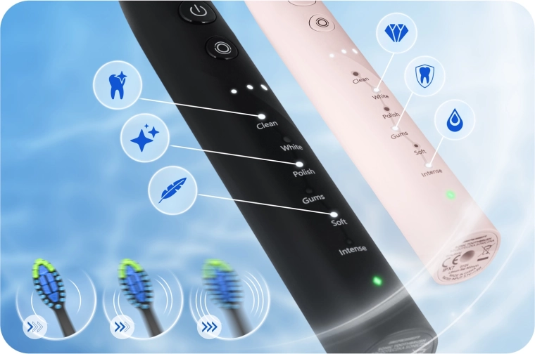 Scegliete tra 18 combinazioni di pulizia – 6 modalità (Clean, White, Polish, Gums, Soft, Intense) e 3 livelli di intensità. La potente batteria da 800 mAh dura circa 50 giorni con una singola ricarica e la base di ricarica a induzione con USB garantisce un reintegro di energia confortevole. Grazie alla resistenza IPX8, lo spazzolino è pronto per l'uso quotidiano in bagno.