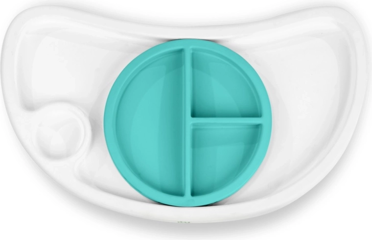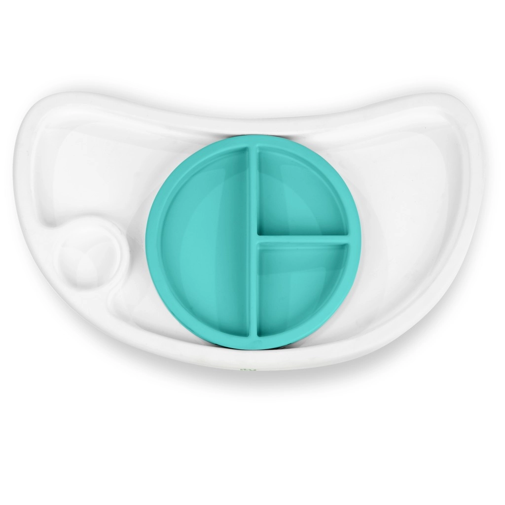 Il piatto a tre scomparti si blocca in sicurezza al vassoio per evitare che il bambino lo butti giù. È adatto al microonde e favorisce porzioni corrette e un servizio ordinato.