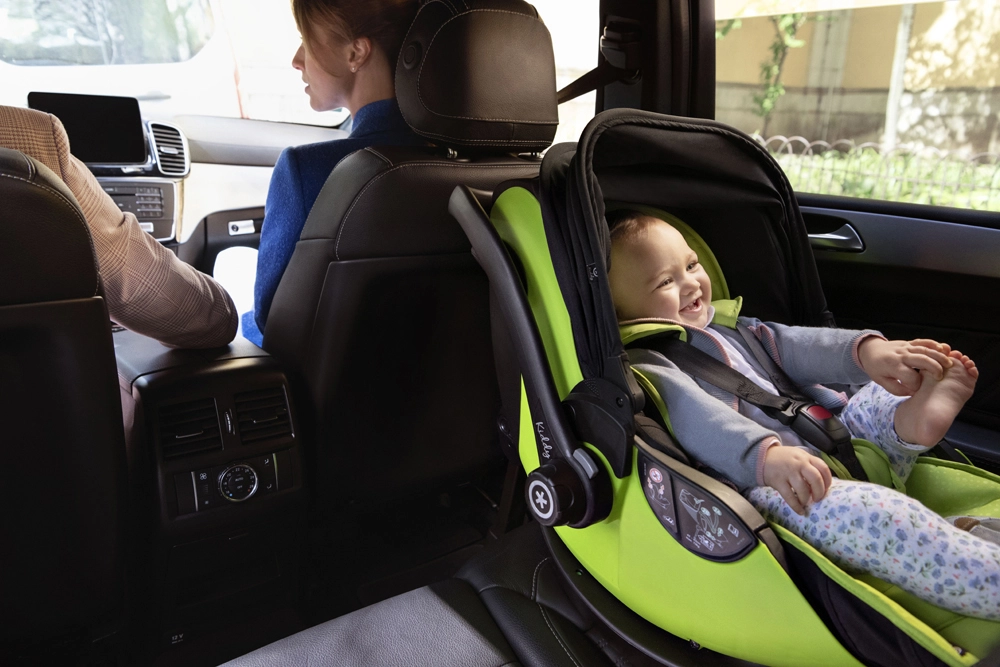 I proteggi-lato e il materiale flessibile nell’area della testa assorbono le forze d’urto. Il morbido inserto e la capottina regolabile garantiscono tranquillità e comfort al neonato.