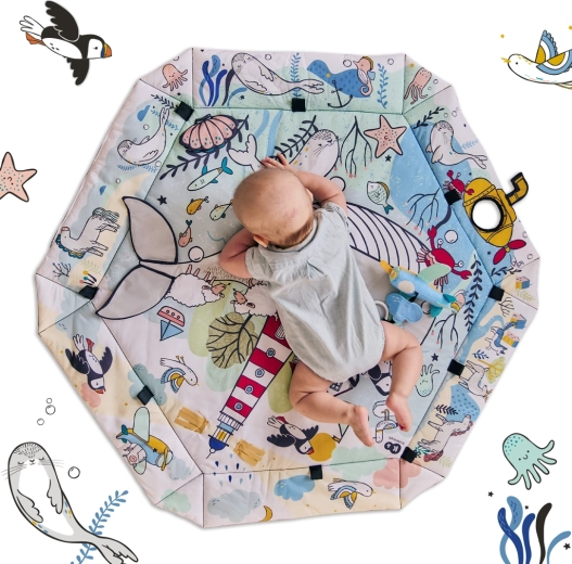 Scopri il tappetino gioco multifunzionale Kinderkraft Smartplay Sea: uno spazio morbido, sicuro e stimolante per i bebè fin dalla nascita. Il tappetino offre un ricco set di 7 giochi (specchietto, libricino frusciante, 2 massaggiagengive, tigre squeak, sonaglino e elefante campanellante), palestrina regolabile, 20 palline e sponde ribaltabili per creare un piccolo “piscinotto”. Supporta vista, udito e tatto, sviluppa motricità fine e grossolana ed è realizzato con materiali sicuri secondo EN 71-1.