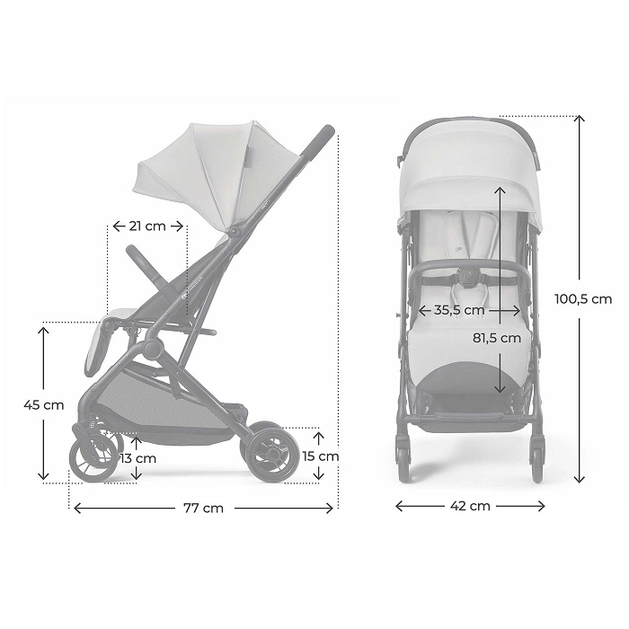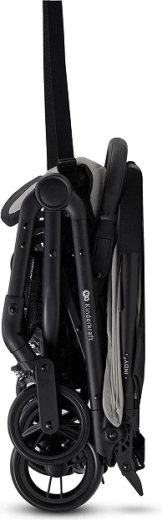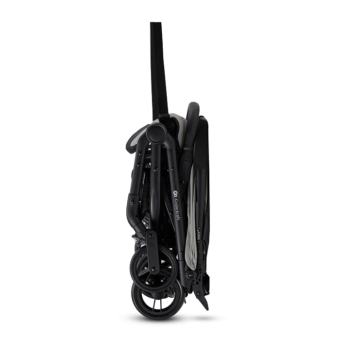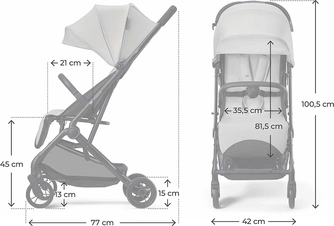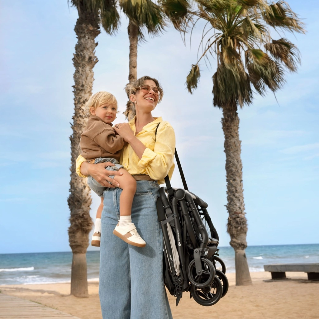 Chiusura semplice con una mano fino a dimensioni compatte di 59 × 43,5 × 21,5 cm. Grazie alla tracolla, il passeggino si trasporta facilmente, sia sui mezzi pubblici, in auto o sulle scale.