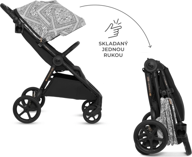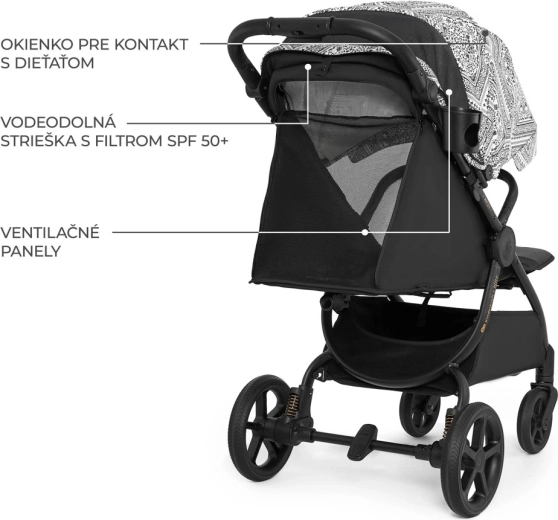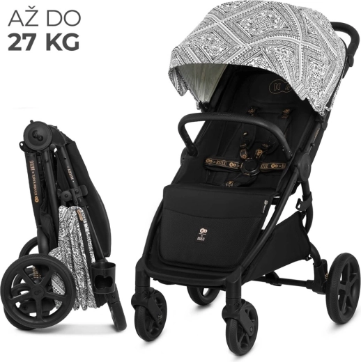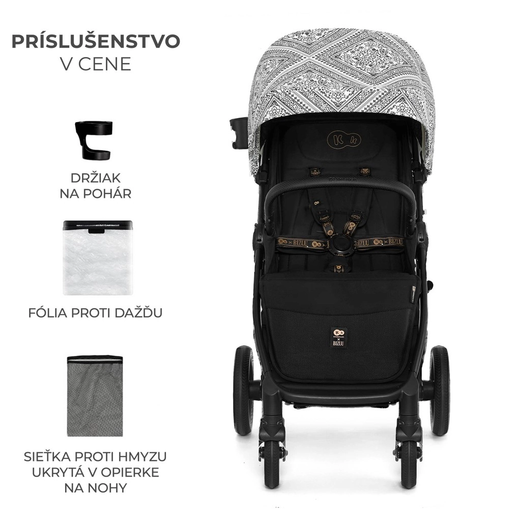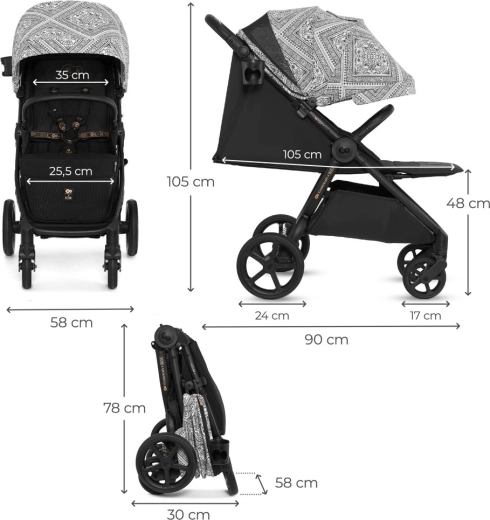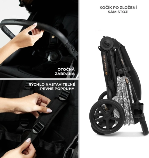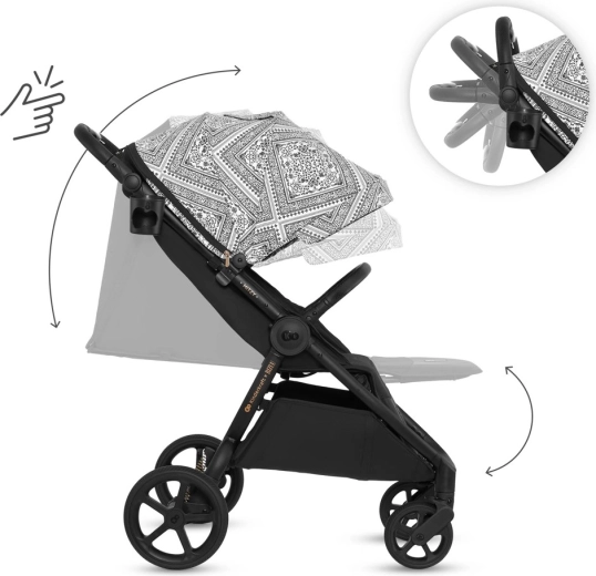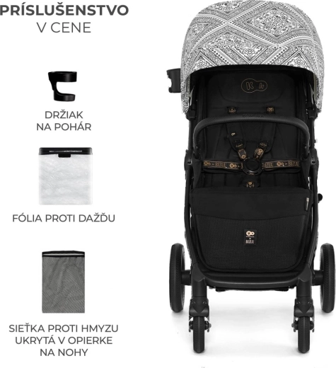 La dotazione include una zanzariera integrata nascosta nel poggiapiedi, un portabevande e un parapioggia. La sicurezza è garantita dalle cinture imbottite a 5 punti con regolazione rapida con una mano e dalla barra di protezione girevole e apribile per accomodare facilmente il bambino. Il capiente cesto con portata di 5 kg accoglie giochi e acquisti. Il telaio è compatibile con seggiolini auto 0–13 kg tramite adattatori universali (venduti separatamente).