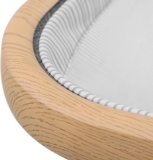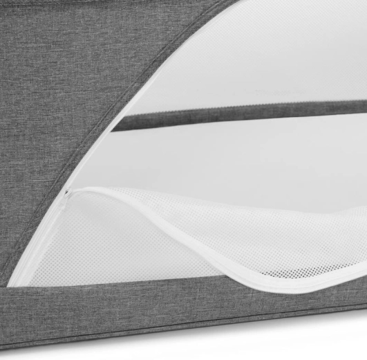 Pannelli in rete favoriscono il flusso d’aria e consentono il contatto visivo con il bambino, mentre il telaio in alluminio con finitura effetto legno garantisce stabilità.