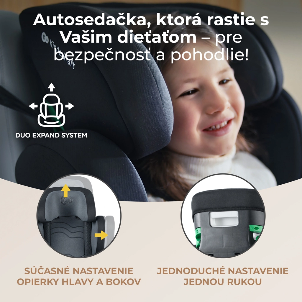 Kinderkraft XPAND 2 i-Size offre un livello superiore di sicurezza e comfort per i viaggi quotidiani dei bambini da 100 a 150 cm. La struttura è conforme alla più recente norma R129/03 i-Size ed è stata sottoposta a test in rinomati laboratori europei. Grazie ai connettori ISOFIX e alla chiara guida cintura con indicatore verde, l’installazione è rapida e intuitiva.