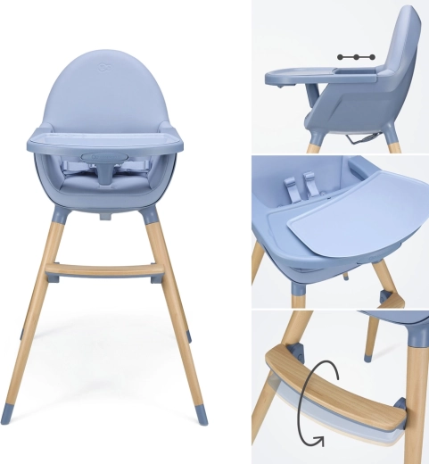 Le stabili gambe in faggio con terminali antiscivolo, le cinture di sicurezza a 5 punti e la barra centrale assicurano un elevato livello di sicurezza. Lo schienale ergonomico, la seduta ampia e profonda e il poggiapiedi regolabile garantiscono comfort durante i pasti e il gioco. La maniglia integrata sullo schienale consente un facile trasporto con una sola mano.