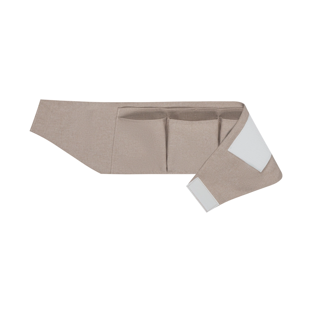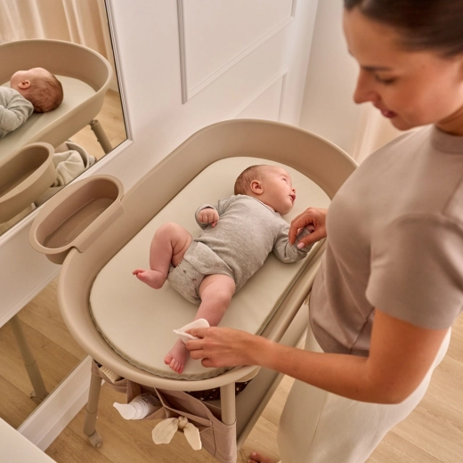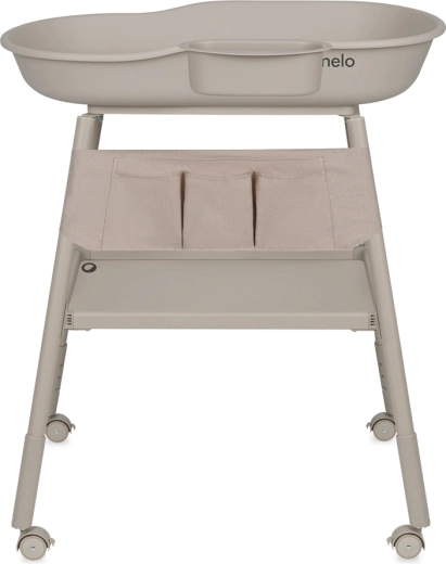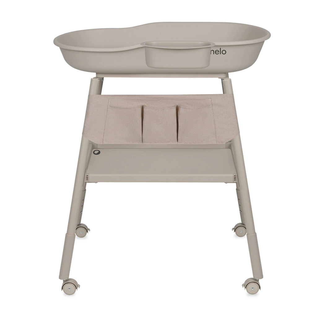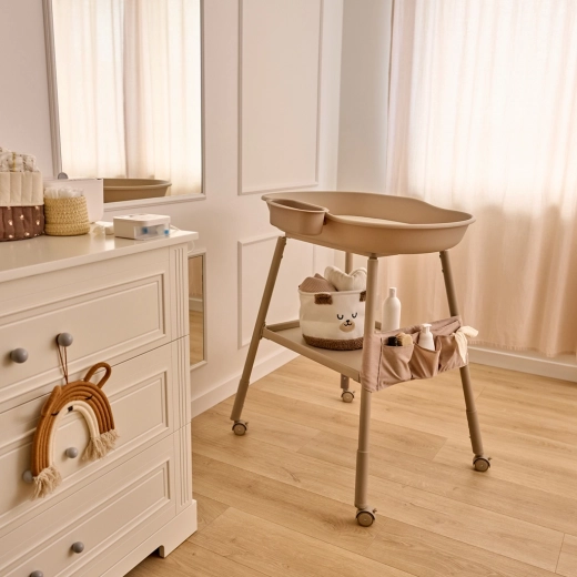 Organizzazione senza sforzo: organizer in tessuto con 5 tasche, ampio ripiano inferiore e vaschetta laterale rimovibile tengono tutto l’occorrente a portata di mano. Le quattro ruote con freni permettono di spostare il fasciatoio senza fatica dove serve — dal bagno alla cameretta e viceversa.