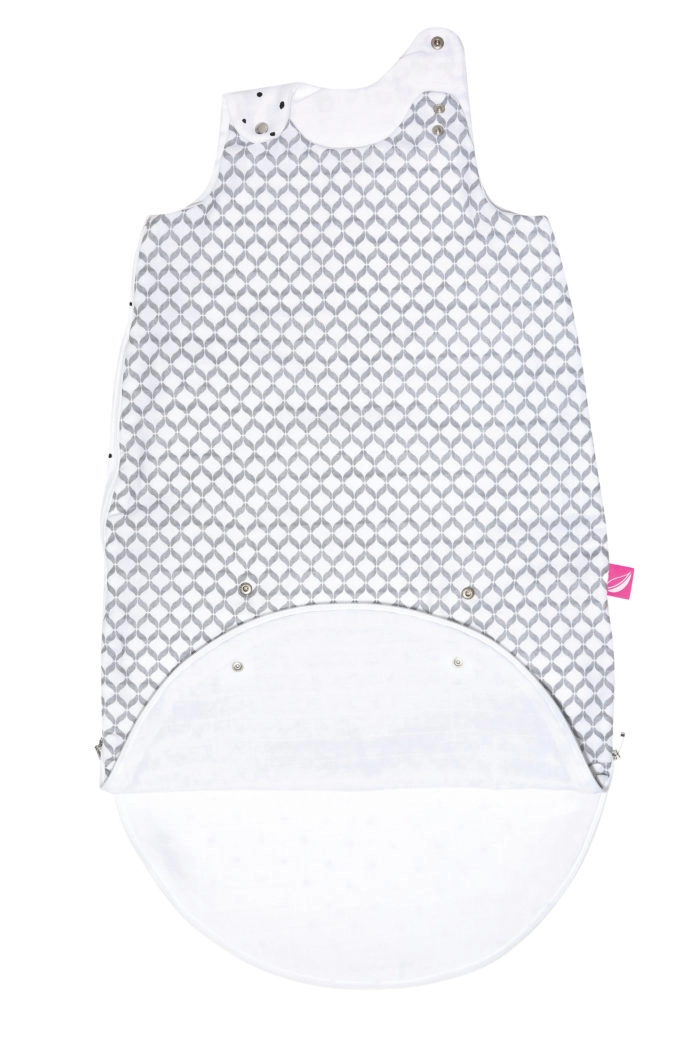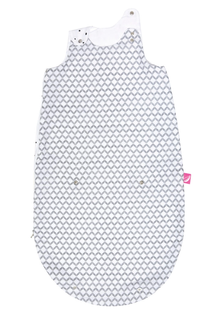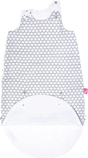 Sistema pratico 2 in 1: sacco chiuso per 3–6 mesi, dopo l’apertura per 6–18 mesi. I bottoncini sotto le ascelle riducono l’apertura per le manine dei bimbi più piccoli.