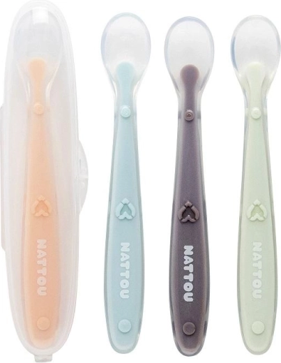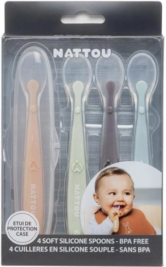 Pratico set di quattro cucchiaini per bambini NATTOU per un'alimentazione confortevole di neonati e bambini piccoli. Grazie alla punta in silicone extra morbida e flessibile sono delicati sulle gengive sensibili, le impugnature ergonomiche facilitano la presa e il silicone resistente al 100% senza BPA garantisce un uso sicuro a casa e in viaggio.