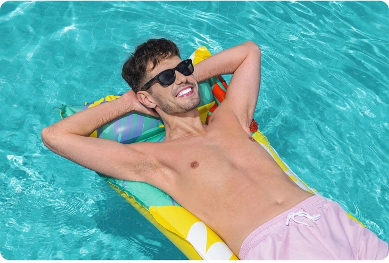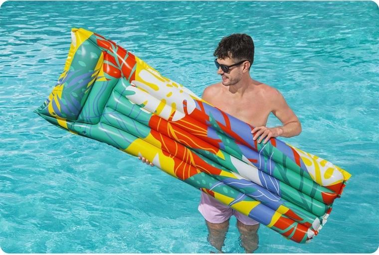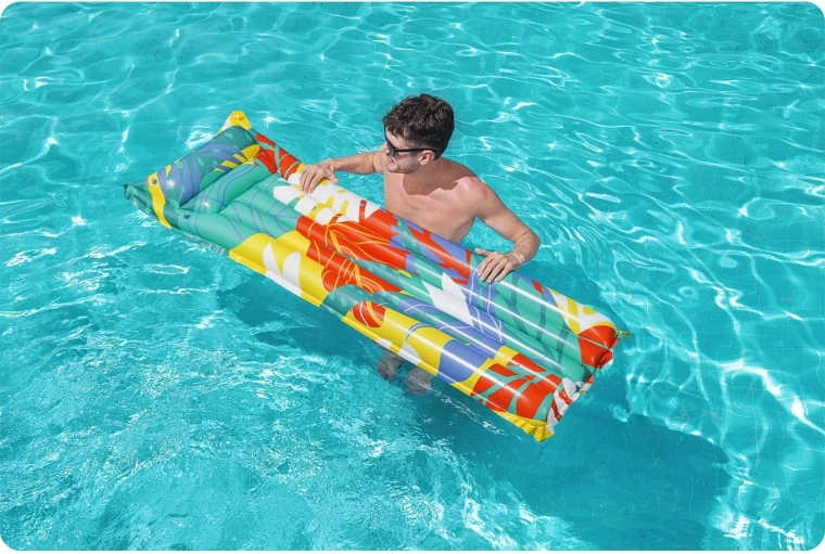 Il materassino gonfiabile BESTWAY è perfetto per il relax e il divertimento estivo. Grazie alla struttura leggera e resistente in PVC, si trasporta facilmente, si gonfia in fretta e offre una comoda superficie per sdraiarsi con supporto per la testa. Il vistoso design tropicale cattura subito l’attenzione e dona stile ai tuoi momenti di relax in acqua.