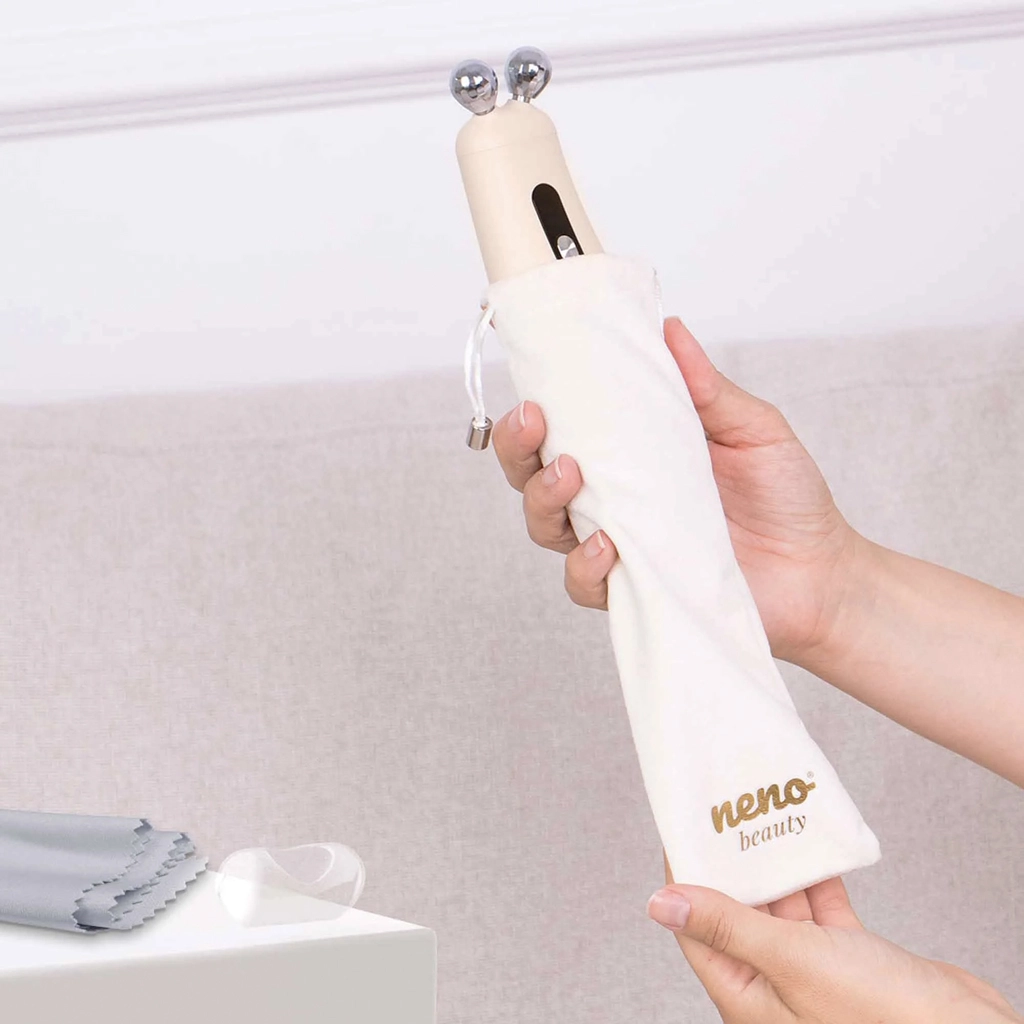 Nel set elegante trovi anche coperture protettive per le testine, custodia e panno in microfibra per un uso igienico e una manutenzione semplice. Per sicurezza ed efficacia massime, usa un gel conduttivo per RF/EMS ed esegui i movimenti di massaggio dal centro del viso verso l’esterno e delicatamente verso l’alto.