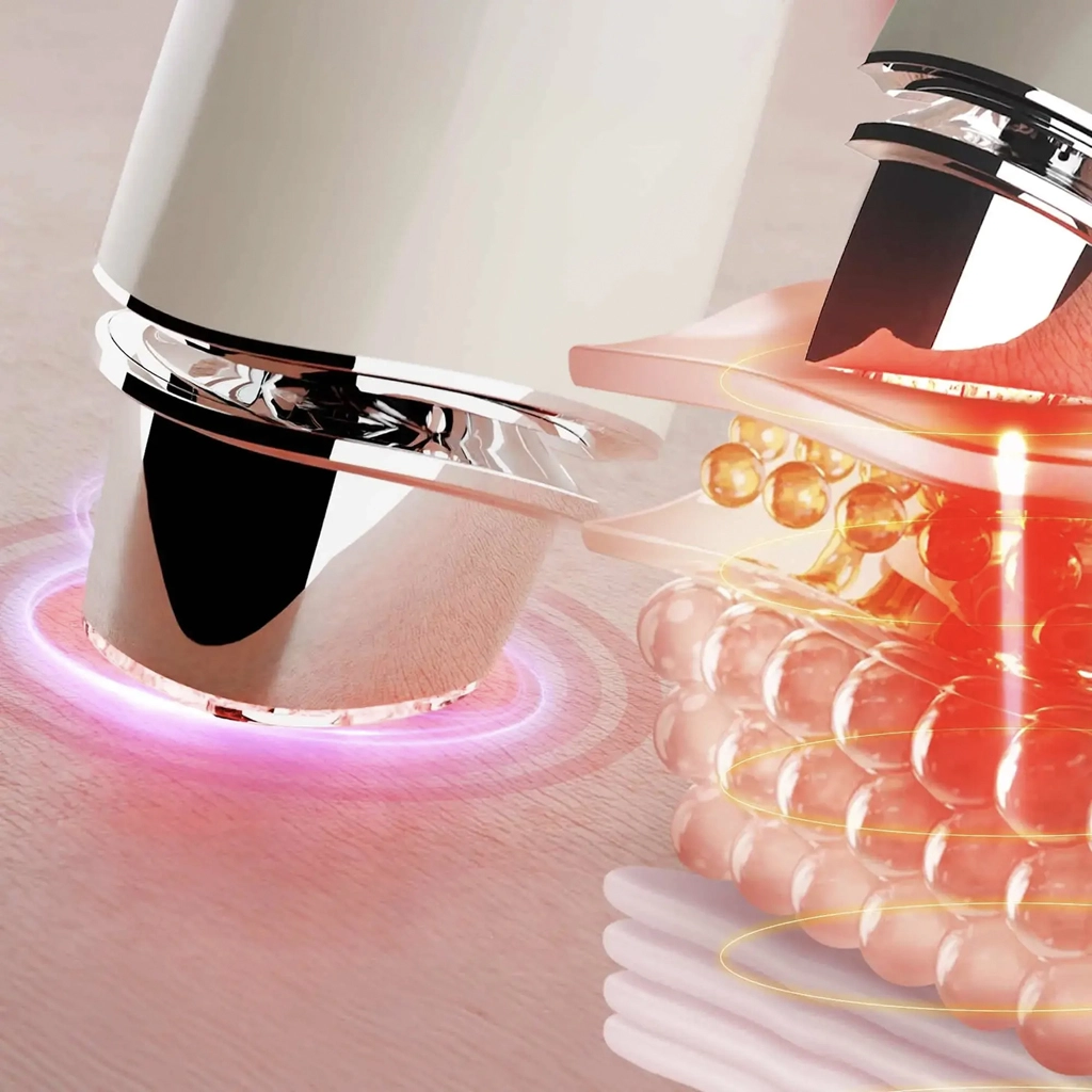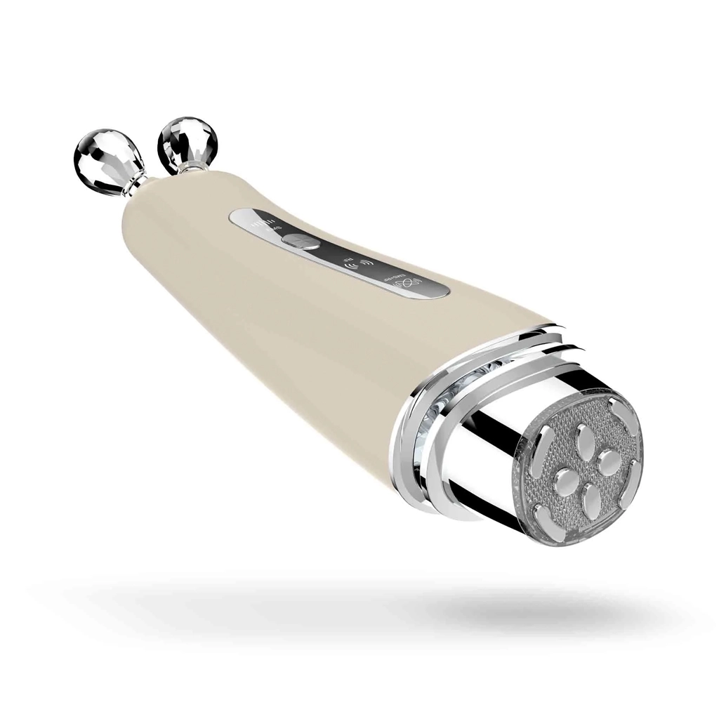 Puntali massaggianti a diamante per modellare con precisione le linee e testina piatta con otto punti per illuminare, lenire e sostenere la microcircolazione tramite luce e vibrazioni.