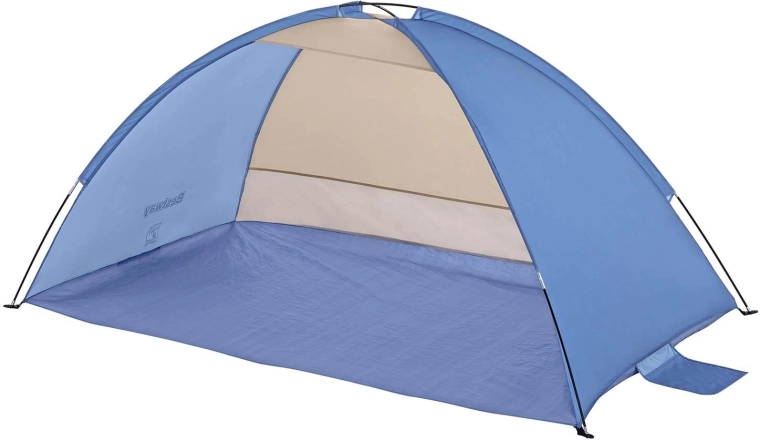 Le pratiche tasche per la sabbia sono integrate dai quattro picchetti forniti per un ancoraggio affidabile. Inclusa anche una borsa da trasporto con manico, così potrai portare la tenda ovunque con facilità. Le dimensioni 200 × 120 × 95 cm offrono uno spazio confortevole per due persone e il pavimento protegge da umidità e sabbia.