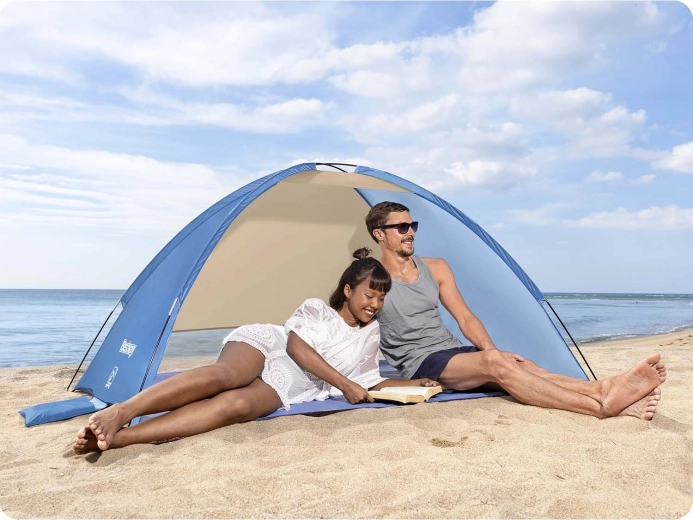 Goditi comfort e sicurezza in spiaggia con la tenda Bestway Beach Ground 2. Il resistente poliestere 190T con finitura superficiale PA 300 mm e l'elevata protezione UV UPF 80+ proteggono dal sole e dalla pioggerellina, mentre il lato frontale aperto assicura la circolazione dell'aria. Grazie alle aste in fibra di vetro, la struttura è elastica, stabile e rapidamente pronta all'uso.